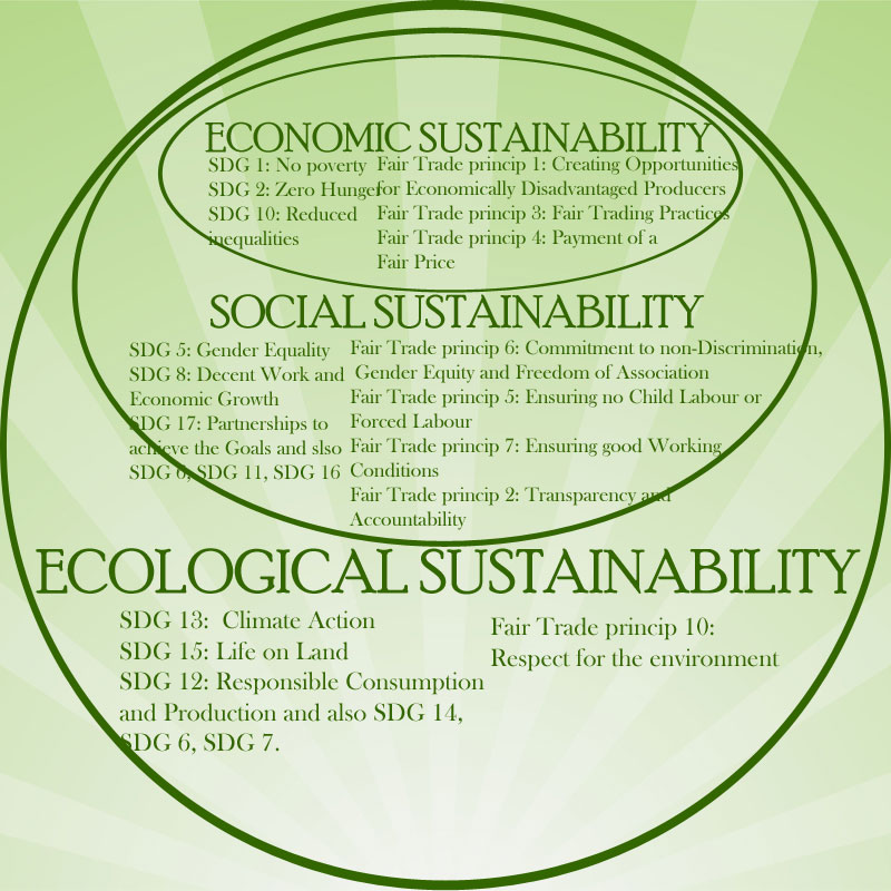 For example, Fair Trade principle number 1 is “Creating opportunities for economically marginalized producers”. It is perfectly in line with SDG number 1 No poverty. Fair Trade principle number 10”Respect for the environment” reflects SDG 12 Responsible consumption and production, 13 Climate action and 15 Life on land. Another example is Fair Trade principle number 6, which is reflected by SDG 5 Gender equality. Finally, Fair Trade practice in its daily work and at grass root level SDG 17: Partnership for the goals.